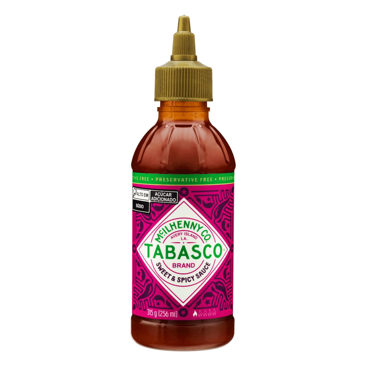 INGREDIENTES: Açúcar, pimenta vermelha, água, vinagre destilado, pêra concentrada, alho, cebola, molho de pimenta vermelha Tabasco, gengibre, sal, especiarias, espessante goma xantana. NÃO CONTÉM GLÚTEN